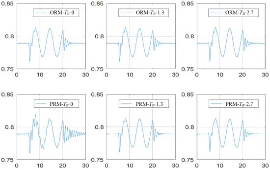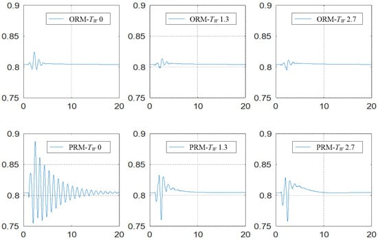 (2) When TW = 0, the power angle δ, rotor speed x, and output power P in ORM are more stabled than in PRM; when TW ≥ 1.3, the stability of power angle δ, rotor speed x, and output power P in PRM is better than in ORM.