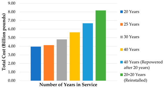 As shown in Figure 5 and Figure 6, the use of existing offshore wind infrastructure for electricity production through life extension and repowering at the end of initial design life is a more cost-effective option compared to the commissioning of a new offshore wind farm. This observation is in agreement with those reported by other researchers, e.g., [48,49]. The analysis performed in this study on London Array wind farm shows that by extending the operational life of the existing wind farm using turbines of the same capacity or retrofitted turbines of higher capacities, a significant saving of up to £2 billion can be made in the capital investments. Seen also in Figure 6 is that although the overall cost of life extension beyond 20 years has been found lower than the repowering cost by up to £2.5 billion, the use of retrofitted wind turbines with higher capacities in the second 20 years lifespan in an existing wind farm can produce much more electricity which would justify the need for further investment compared to the cost of life extension. It is worth noting that while repowering is an attractive and cost effective option for the offshore wind industry, it would need resilient offshore wind infrastructure and accurate structural health monitoring systems and structural integrity assessment procedures to ensure that the aged foundations can sustain the larger wind turbines during the extended life period.