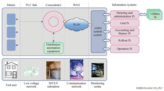 Generic architecture of an Advanced Metering Infrastructures (AMI) with last-mile Power line communications (PLC) connectivity (source: ITU-T G.9903 [1]).