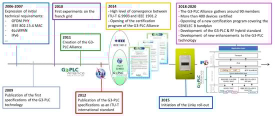 Section 2 sheds some light on the history of the G3-PLC technology, developed in the context of the Linky program. Section 3 introduces standardization challenges and opportunities encountered in the operation of NB-PLC in the low voltage (LV) grid. Then, the G3-PLC Hybrid PLC & RF profile and enhancements proposed by the G3-PLC Alliance are discussed in Section 4. Finally, concluding statements are made in Section 5, sketching a long-term vision of NB-PLC in the context of a 5G-driven telecommunication technology landscape.