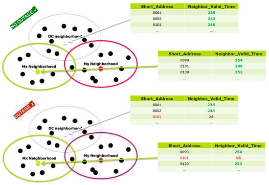 This feature is derived from the capabilities of G3-PLC to recognize channel conditions between neighbouring nodes. Each G3-PLC node’s neighbour table (NT) is populated with channel estimation data towards each possible neighbour node. While this mechanism initially intends to optimize the modulation scheme to achieve the best compromise between data rate and robustness, cross-checking the NTs of different G3-PLC nodes may lead to the recognition of a repeated deviation of the NT entry’s valid time for a particular node with respect to others. In fact, an outdated valid time for a specific node reveals the absence of communication towards this node. As shown in Figure 4, if the same deviation is found in several NTs (maintained by several nodes), then a power outage is suspected at a particular location (the repeated deviation is found for only one node) or in an area (repeated deviations are found for several nodes).