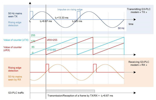 Hence, ITU-T G.9903 [1] specifies a dedicated phase detection mechanism. The delay between the mains signal zero crossing on rising edge and the currently processed data transmission is computed and included in a dedicated header in the frame sent. This delay corresponds to the current value of an 8-bit counter (cTX) synchronized with the mains signal seen by the transmitter node (TX). Upon reception of the frame by the receiver node (RX), the value of cTX extracted from the frame is compared with the value of the local counter (cRX), which characterizes the time elapsed since the last local zero crossing on rising edge (at the instant of reception). As depicted in the example given in Figure 5, the difference between cRX and cTX (255 − 85 = 170) reveals a phase shift of 120° between the two nodes.