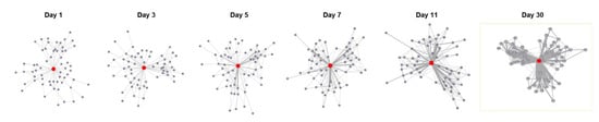As depicted in Figure 7, the abovementioned route analysis is repeated over time during 30 days and results in an aggregated representation of the network, where links are weighed depending on how often they are actually on a path towards a targeted node. The more a link is weighed, the more it is used for communications, the higher the probability this link matches a real electrical connection.