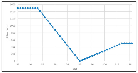 Therefore, the new revision of the G3-PLC specifications will include a controlled jittering mechanism applied when forwarding RREQ messages. By doing so, intermediate nodes help increasing the chances that the route with the lowest RC is always selected by the RREQ destination node. For a given route establishment procedure, after the reception of the first RREQ message, an intermediate node evaluates the jitter time based on the LQI measured for this message. During this period, the intermediate node puts the RREQ message in a queue. If a new RREQ message with lower RC is received, the original RREQ in the queue is overwritten, lowering the flooding, and increasing the probability of forwarding only RREQs that may be selected by the RREQ destination node. Figure 9 shows an example of the calculated jittering delay as a function of the LQI.