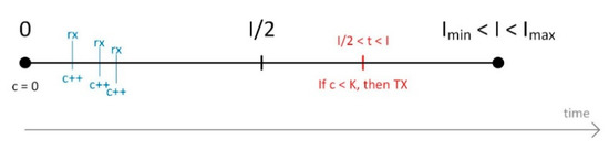 In contrast to the original Trickle algorithm, as defined in RFC 6206 [14], interval doublings are not considered here. For the relation of Imin and Ki, RFC 6206 [14] recommends that “a protocol should set Ki and Imin such that Imin is at least two to three times as long as it takes to transmit Ki packets”. The size of broadcast messages may vary between some 10 s of bytes for control messages and several 100 s of bytes for firmware update messages. Therefore, to avoid preconfiguring Imin to a fixed value based on the longest frames and its negative impact on the latency for smaller control frames, Imin is computed adaptively based on the size of the incoming broadcast frame