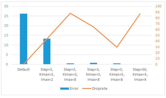 Two performance criteria were used for the evaluation, i.e., the error rate, given as the average percentage of broadcast frames, which have not been received by nodes in the network, and the drop rate, given as the average percentage of frames dropped by nodes in the network because the condition c < Ki was not met. Higher drop rates lead to a lower number of messages in the network, reducing the risk of collisions and channel access failures. The test results are summarized in Figure 13 for different combinations of parameters.