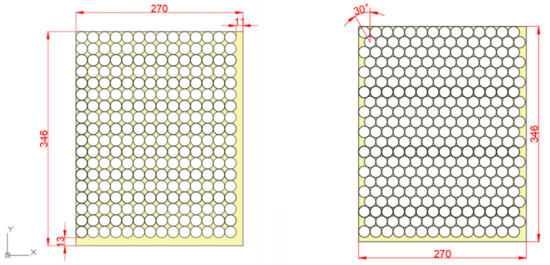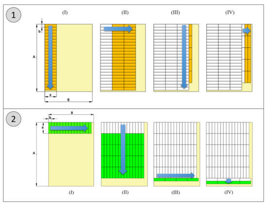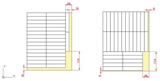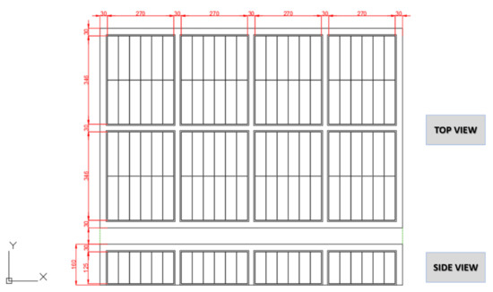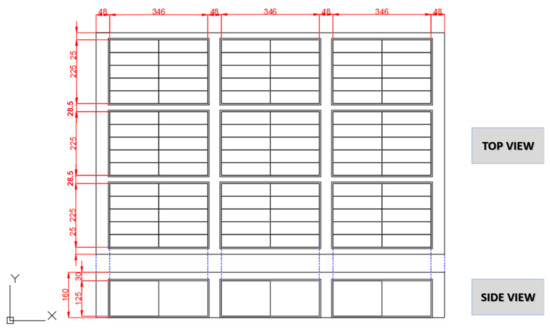 The second Panasonic cell results a in higher capacity, thus representing the best solution. Four modules are considered, as depicted in Figure 9: two of them contain 10 rows of 31 cells each, while in two other modules, 20 rows of 11 cells are alternated with 20 rows of 10 cells. Hence, 840 cells and 1160 cells are, respectively, inserted in the two couples of modules.