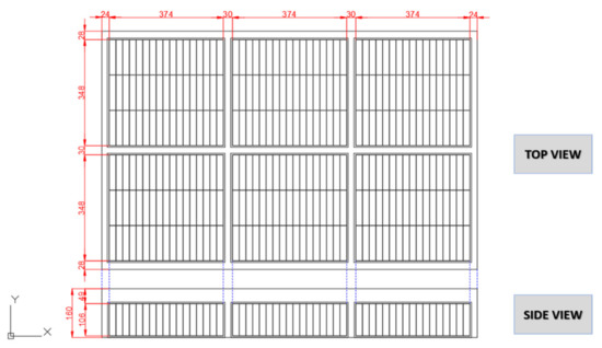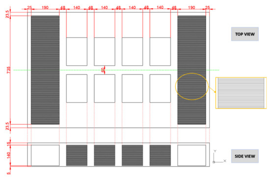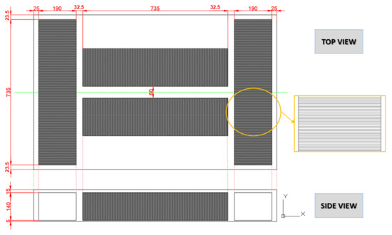 Figure 3 shows the original scheme of the BMWi3 battery pack, reporting the top and side view, detailing cells and modules disposal and all the geometrical measurements.