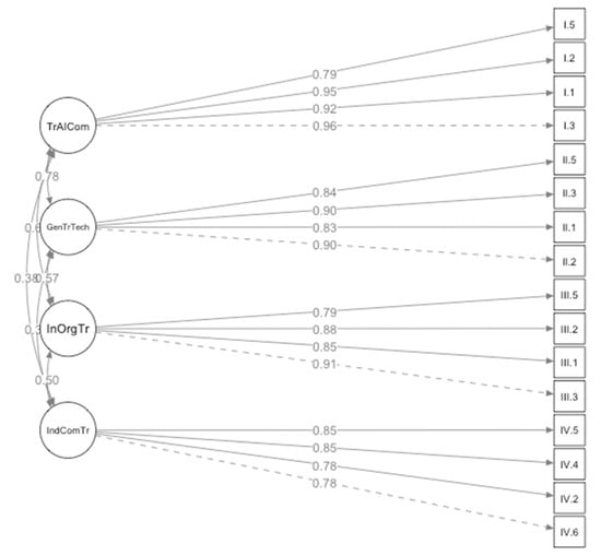 The applied research procedure assumes that the measurement model (CFA) should be correct in terms of reliability, consistency and validity of measures. Meeting these conditions forced the number of items for latent variables to be modified. For each latent variable (TrAICom, GenTrTech, InOrgTr, IndComTr), two items were removed. As a result, each variable consists of four items (see Table 1). The results of constructional correctness and CFA fitting quality measures are shown in Table 2. Additionally, in Table 2 the correlation coefficients between the latent variables are shown under the main diagonal.