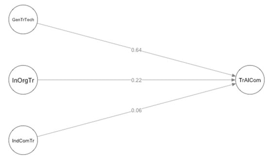 The simultaneous impact of all three latent variables (GenTrTech, InOrgTr, IndComTr) on employees’ trust in AI in the company (TrAICom) was examined by applying SEM. The results of the model describing such a relationship are presented in Figure 2 and Table 3.