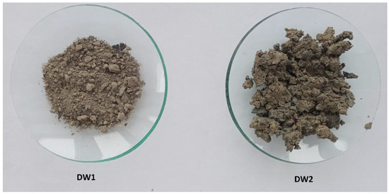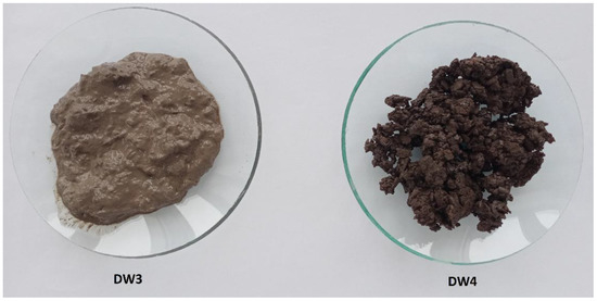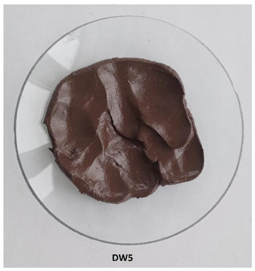 The drilling waste used was produced in a technological process where three types of drilling fluids, synthetic, potassium-polymer, and barite, were used. The tested waste was characterized by different compositions, consistencies, and colors and came from different stages of the drilling process. The abovementioned drilling wastes and their water extracts were used as a matrix material for tests allowing us to optimize the process of separating silver nanoparticles from the drilling wastes matrix. Figure 1, Figure 2 and Figure 3 present 3 photographs of the DW1–DW5 drilling waste used in this study.