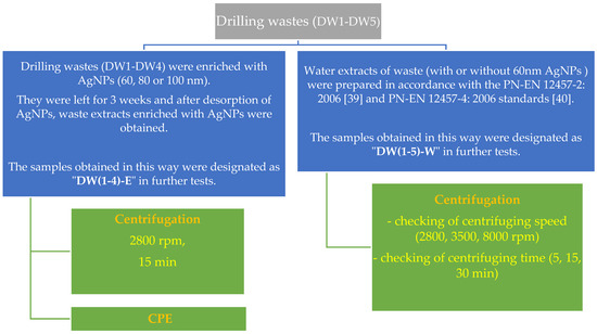 Diagram showing the preparation of test samples of drilling waste enriched with AgNPs (samples DW(1–4)-E) and water extracts of drilling waste (samples DW(1–5)-W). Methods and detailed parameters of AgNP separation used during the studies are also presented. Two research procedures were used with waste samples. The first involved enrichment of drilling waste with silver nanoparticles and desorption of nanoparticles (NPs) into an aqueous solution. At this stage, waste extracts enriched with AgNPs were obtained, and samples after this stage were labeled as DW(1-4)-E. The second stage of the research was to obtain water extracts of drilling waste, which were then enriched or not with AgNPs and subjected to further tests. Samples after this stage of research were labeled as DW(1–4)-W.