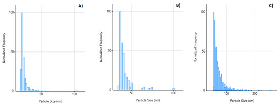 Silver particle size distribution recorded by the spICP-MS technique for a sample of water extract of drilling waste without added AgNPs designated as DW1-W (A), DW2-W (B), and DW3-W (C).