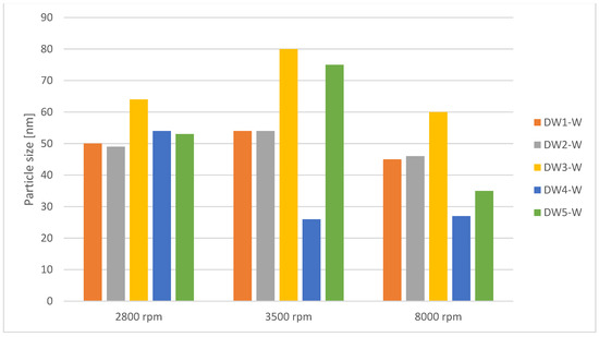 Results of particle size measurements in DW(1–5)-W drilling waste water extract samples with the addition of AgNPs (60 nm) for three different centrifugation speeds (2800 rpm, 3500 rpm, and 8000 rpm).