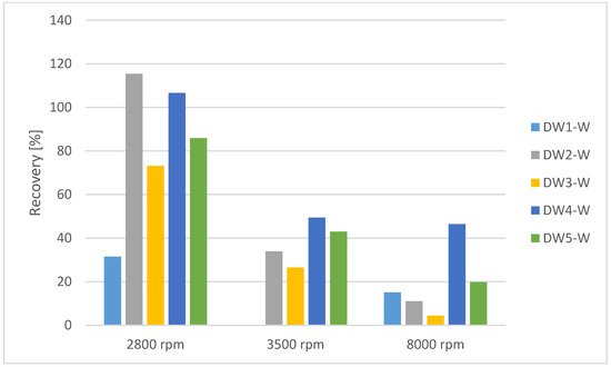 Recovery calculated from mass concentration for three centrifugation speeds (2800 rpm, 3500 rpm, and 8000 rpm) for DW(1–5)-W water extract samples of drilling waste with AgNPs (60 nm).