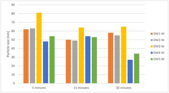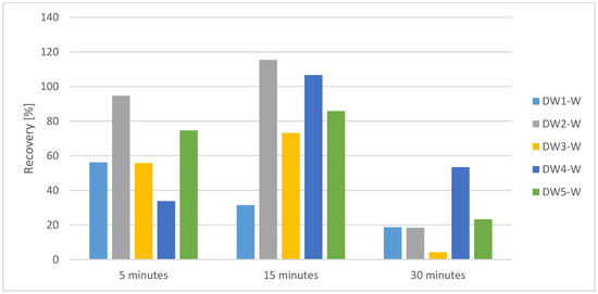 Figure 8 shows the particle size results (median) obtained for the individual water extract samples DW(1–5)-W at the sample centrifugation times verified. The recoveries calculated on the basis of mass concentration for wastewater extract samples without and with AgNPs after centrifugation at 2800 rpm for 5, 15, or 30 min are presented on Figure 9.