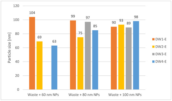 The following diagram (Figure 11) shows a comparison of median particle size in samples of DW(1–4)-E drilling waste extracts with AgNPs (60, 80, or 100 nm) after centrifugation or CPE.