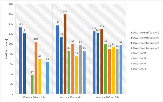 Particle size comparison of drilling waste samples enriched with AgNPs DW(1-4)-E of different sizes. Silver nanoparticles of three sizes, 60, 80, or 100 nm, were added to the samples. The graph shows the results obtained for particle size obtained after separation by CPE or centrifugation.