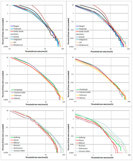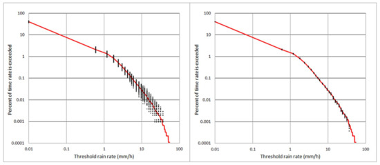 - Variation in percentage of time exceedance of rain rates for 2 sample sizes (2 years and 16 years), including all data.