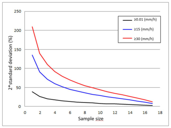 - Variation in +2 standard deviations (wet conditions) for 3 rain rates (≥0.01 mm h−1, ≥15 mm h−1, and ≥30 mm h−1) for 17 sample sizes including all data.