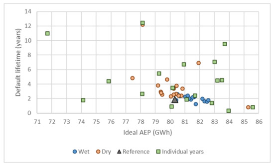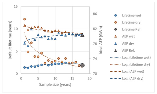 - Variation in lifetime in default operation for ±2 standard deviations (wet and dry conditions) for 17 sample sizes including representative selected data.