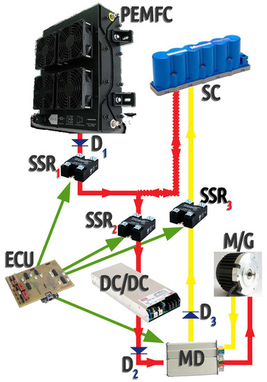 The architecture of the electrical system, where PEMFC is the Proton Exchange Membrane Fuel Cell, SC is the Super-Capacitors bank, DC/DC is the isolated buck-boost DC/DC converter, M/G is the electric Motor/Generator, MD is the Motor Driver, ECU is the Electronic Control Unit, SSRs are the Solid State Relays and Ds are the high power diodes. The red line indicates the energy flow during the normal mode operation. The dotted part of the red line indicates bidirectional flow of energy. The yellow line indicates the energy flow during the regenerative mode operation. The green line represents the communication between the ECU and the actuators of the EMS.
