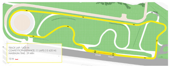 The proposed ROS-based EMS system was thoroughly tested on the prototype HEVs and the prototype chassis dynamometer [32] of the TUCer team. The prototype urban concept racing HEV Spyros Louis, equipped with the proposed EMS, took part at the SEM Europe 2019 (Figure 1). To successfully complete the race, the vehicle had to complete 11 laps in a closed track, Figure 6, in no more than 39 min. Each time that the vehicle was completing a lap, it had to perform a stop-and-go procedure of 5 s. The length of the track was 1420 m. The EMS operated faultlessly and proved its reliability and robustness. Moreover, the fine tuning process during the trial laps and between the races was straightforward, thanks to the modular design of the ROS-based controller and the deployment of the FSM. The Figure 7, Figure 8, Figure 9, Figure 10, Figure 11 and Figure 12 are diagrams presenting the values of the most important EMS parameters. These values were collected using data logged during the three first laps of the first race of the SEM Europe 2019.