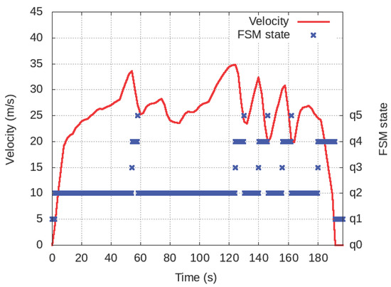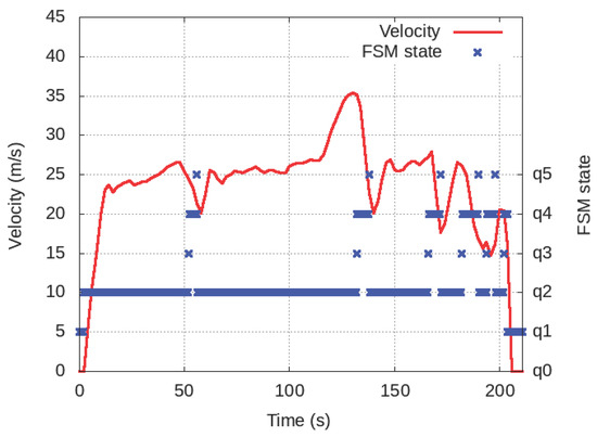 Figure 7 depicts the velocity values of the HEV, along with the states’ transitions during the 215 s period of the first race lap. The HEV accelerates until the 140th second. The FSM state is shifted from the state to at the first second, as the vehicle starts to operate at normal mode and remains unchanged until the 140th second. At the period from the 140th second to the end of lap there are successional transitions of the EMS operation between normal and regenerative mode. At this part of the lap there were successive turns on the race track, where the vehicle was successively accelerated and decelerated, before and after the turn respectively. The states’ transitions follow the variations of the velocity profile. Thus, for example, during the first deceleration phase, starting at the 140th second, the FSM is shifted from the state to the intermediate and from there instantly to the state, where it remains for a couple of seconds until the driver accelerates again. At this acceleration phase the FSM is shifted from to the intermediate fail safe and instantly back to , where it remains during the rest of the normal mode operation. For the last 5 s of the lap, the vehicle is standstill due to the stop-and-go procedure, and the FSM state finally changes to , as soon as the velocity value of the vehicle decreases below the velocity threshold.