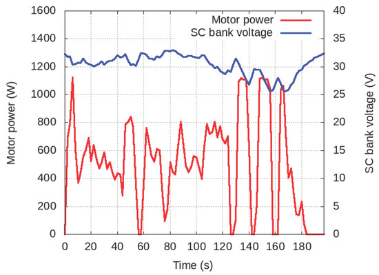 As shown in Figure 12, the electric power consumed by the motor varies between 0 and 1100 W approximately until the 122th second. The zero values correspond to a regenerative mode phase from the 48th to the 58th second. At the same period, from the start until the 122th second, the voltage value of the SC bank is reducing, apart from the deceleration phase of the vehicle, from the 27th to the 58th second, where the value increases due to the low power consumption and the regenerative mode phase. After the 122th second, there are four successional transitions of the EMS operation between normal and regenerative mode, the motor power turns to zero whenever the HEV decelerates and the SC bank voltage value increases and decreases respectively. This happens, for example at the period from the 165th to the 172th second. At the last 5 s of the lap the motor power is zero and the SC bank voltage increases, as the vehicle is standstill due a stop-and-go interval.
