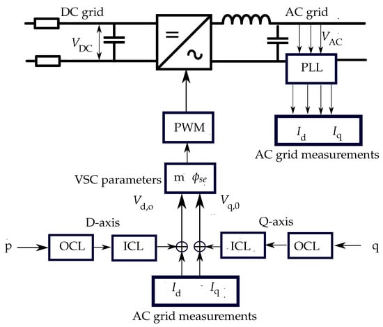 The VSC is assigned control actions to regulate active and reactive power in the MV AC-DC distribution grid. The VSC regulates active and reactive power flows to achieve control actions, such as regulating the voltage magnitude at the AC or DC terminals of the VSC or controlling the power flowing from one system to the other. The control actions is achieved by the VSC by controlling the active power and reactive power flow according to the active power set-point p and the reactive power set-point q given to the outer control loop (in the following, the internal converter set-points are labeled with the suffix, “0”). In the “dq” control, the three-phase AC currents and voltages measured at the point of common coupling are transformed into the dq-domain as and components for the current and and components for the voltage. The VSC is controlled to achieve the active power set-point p by regulating the d-axis current component represented by (11). Similarly, the reactive power q in the VSC represented by (12) is regulated by controlling the q-axis component . The outer loop controls the active p and reactive q by generating the current components and , which are current set-point sent to the inner loop []:
