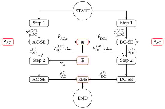 In a centralized single-step SE, both the AC and DC grid is integrated into the same model, and their electrical quantities are estimated within the same SE process. The proposals in References [,,,,] are examples of these centralized solutions. In the following, the details of some of these approaches are presented to provide some insights on the pros and cons of centralized approaches.