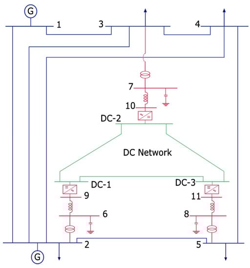In the AC grid, the traditional choice of the state vector is given by the voltage magnitudes and phase angles at all the nodes of the grid (see Equation (8)). The states of the DC system can be chosen as the set of the voltage magnitudes at all the nodes of the DC grid (see Equation (9)). The state variables estimated in the two SE processes for the AC and the DC grid, respectively, thus, are the following: