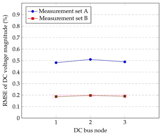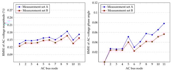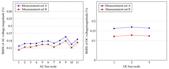 Further tests have been performed to complement the results found in case I. As previously described, in case II, DC grid measurements are considered with a lower uncertainty equal to 0.5%. Figure 6 shows the results of the voltage magnitude estimation in both the AC and DC grid for this test. On the AC grid, the obtained improvements are between 10% and 13%, thus being slightly better than those achieved in case I. The reason for this is associated to the more accurate information received from the dc estimator, due to the lower uncertainty considered for the dc measurements. Vice versa, on the dc grid, the improvement obtained through the measurement set B is less significant than what was found in case I. The reduction of the RMSE is in fact around 25%. The motivation behind this is associated to the better DC voltage estimation obtained at the first estimation step, which leaves less space for improvements. Even in this case, however, the beneficial contribution given by the imported AC voltages for the DC voltage estimation is still evident.