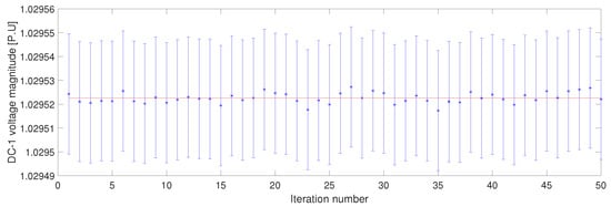 As a final result for this scenario, the statistical uncertainties obtained via the Monte Carlo simulation have been compared to the theoretical uncertainties extracted from the estimator through the inverse of the Gain matrix computed in the second step of the SE process. Figure 7 shows the estimated values of the voltage at the DC bus DC-1, together with the associated theoretical uncertainty obtained considering a coverage factor of 3 (the presented result is related to the first 50 Monte Carlo iterations of the case I test). The Figure clearly shows that the true value (in red) always lies within the estimation interval given by the computed uncertainty limits. Table 5 shows a summary of the statistical and theoretical uncertainties obtained in the same test. For the sake of brevity, only the DC grid results are reported, but the same considerations also hold for the AC grid estimation results. It is possible to observe that statistical and theoretical uncertainties always match, which indicates the correct implementation of the two-step SE algorithm and the proper management of the existing uncertainties via the uncertainty propagation process described in Section 4.