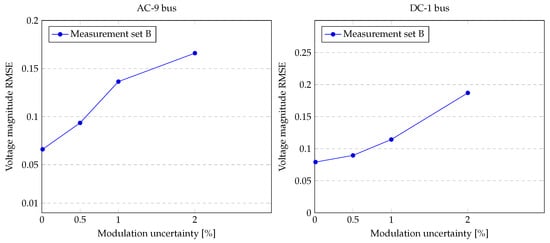 In this scenario, an additional set of tests has been carried out to investigate the impact of the uncertainties associated with the PWM modulation index. As shown in Section 4, the uncertainty of the PWM modulation index enters into the uncertainty propagation process, thus affecting the final uncertainty of the additional voltage magnitude inputs introduced in the second SE step. To analyze the impact of this source of uncertainty, tests have been performed by considering varying values of uncertainty for the modulation index. Figure 8 shows the impact of the modulation index uncertainty for the voltage estimation at the terminals of one of the AC-DC converters (namely for AC-9 and DC-1 buses). It can be observed that lower levels of modulation index uncertainty lead to better estimation results. This is because the voltage magnitude estimations acquired from the other grid are less affected by the uncertainty of the modulation index. When reducing the uncertainty of the modulation index to values close to 0, the RMSEs of the estimated voltages exhibit a saturation effect. This indicates that the estimation errors are approaching the lowest limit that is possible to achieve via the introduction of the voltages (with their uncertainties) from the neighboring grid. Tests with increasing uncertainties of the modulation index lead to RMSEs that tend asymptotically to the values found for the measurement set A. This is because, for high modulation uncertainties, the uncertainty propagation process in (28) makes the voltages imported from the other grid very inaccurate. In these conditions, the contribution brought by the voltages taken from the neighboring grid is almost insignificant.