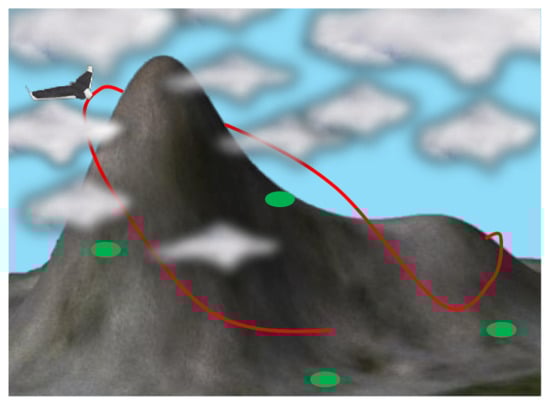 The large size and high altitude of mountains create challenges for battery-powered UAVs, since they are limited in energy capacity. Considering this, solar-powered UAVs become an alternative [,]. In this paper, we consider using a solar-powered UAV to inspect mountain sites; see Figure 1. A solar-powered UAV can harvest energy, and the harvested amount highly depends on several factors. Firstly, the mountains may create shadow areas where the UAV cannot have line-of-sight (LoS) with the sun. Then, the harvesting power drops significantly. Moreover, the existence of clouds reduces the intensity of solar power. A solar-powered UAV can harvest more energy when flying above clouds than that when flying below clouds. Moreover, the harvesting power is influenced by the sunlight direction [,]. For example, the harvesting power at noon is usually larger than that at sunrise. It is necessary to take all these factors into account to obtain an accurate estimation of the harvested energy.