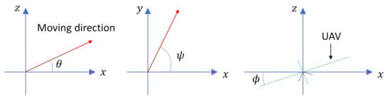 Let be the position of the UAV at time t in the Earth-fixed reference frame. We consider the following model for the UAV’s motion: