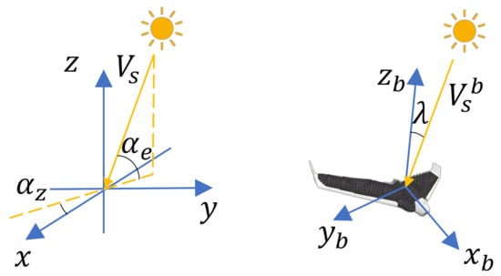 The incidence angle depends on the azimuth angle and the elevation angle of the sun [,], both of which vary with time. In the Earth-fixed reference frame, the sun’s position vector, denoted by , is computed by (where the superscript T represents transpose); see Figure 3. The sun’s position vector can be converted into the UAV body-fixed reference frame: , where , , and are the rotation matrices. Then, in the UAV body-fixed frame, we have , where is the unit vector along the z-axis of the body-fixed frame; see Figure 3.