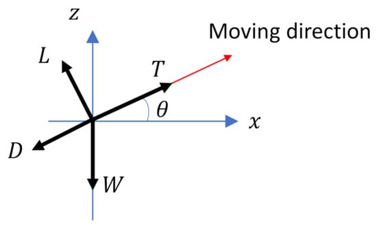 Let W denote the gravity on the UAV, D denote the drag force (parallel to the UAV moving direction; see Figure 4), and L denote the lift force (perpendicular to the UAV moving direction; see Figure 4). These forces have the following relationships: