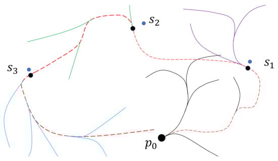 A illustrative feasible inspection tour. The random trees are in different colors, and the red dash curve is a feasible tour. The feasible tour is obtained by repeatedly backtracking the parent of the vertex from the one falling into the neighbourhood of in the last random tree.