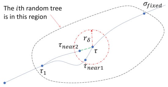 In the ith random tree, there is one vertex located inside the neighbourhood of , which is the root of the ith tree. If , this vertex is located at . Additionally, there is one vertex falling into the neighbourhood of , as once such vertex is added to the ith tree, and we move onto the construction of the next random tree. Some new symbols and functions used in the improvement method are explained below.