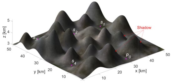 The LoS indicator l depends on the sunlight vector, the UAV’s position, and the mountain surface. To verify the LoS condition between the sun and the UAV, we imagine that the sun is located at , given the position of the UAV p, where is a large number so that the sun is located far enough from the UAV. Then, we can compute a line segment between the sun and the UAV. Following [], if this line segment has any intersection points with the surface S, and, otherwise, .