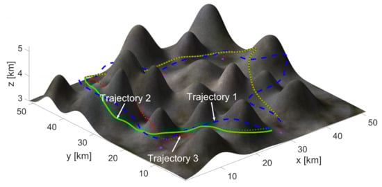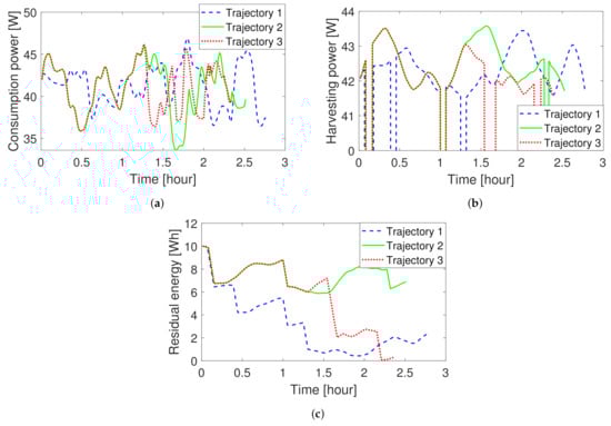 We apply Algorithms 1 and 2 to construct random trees. The obtained trajectories are shown in Figure 10, and the energy consumption power, the energy harvesting power, and the residual energy of these trajectories are shown in Figure 11. We can see that it takes 2.8 h to complete the surveillance mission following Trajectory 1 (which is obtained from the random trees generated by Algorithm 1). Trajectory 2, obtained from the random trees generated by Algorithm 2, achieves much better performance in terms of the residual energy at the end of the mission. Moreover, Trajectory 2 takes less time than Trajectory 1. From Figure 11b, we can see that a smaller part of Trajectory 2 than Trajectory 1 is in the shadow. As seen from Figure 11a, the energy consumption power along Trajectory 1 is generally larger than that along Trajectory 2, and the total consumption energies are 115 and 103.8 Wh, respectively. Trajectory 3, obtained by Algorithm 3, is the same as Trajectory 2 for 1.3 h (see the overlapped part of these two trajectories in Figure 10 and Figure 11). Trajectory 3 takes about 2.39 h to complete the mission, which is 10 min less than that of Trajectory 2. The reason for this is that Trajectory 3 has a larger part inside the shadow regions than Trajectory 2, which harvests less energy but takes less time; see Figure 10 and Figure 11b. As can seen from Figure 11c, the residual energy of the UAV moving along Trajectory 3 is close to zero at the end of the mission. Table 3 summarizes the significant differences between these trajectories.
