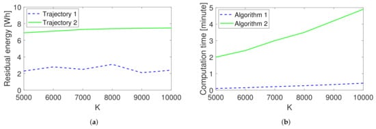 We are also interested in the impacts of several key parameters on our algorithms. K plays an important role in constructing the random trees. To have a look at K’s impact, we keep the set of random samples the same for Algorithms 1 and 2. Moreover, when we increase K, we reuse the existing samples. As seen from Figure 12a, the residual energy of the trajectory obtained by Algorithm 2 increases with K but the increasing rate drops slightly with K. Additionally, the computation time (measured in MATLAB on a computer with Intel(R) Core(TM) i5-6500 CPU @ 3.20 GHz 3.20 GHz and 8 GB RAM) also increases with K; see Figure 12b. The impact of K on the trajectory obtained by Algorithm 1 is different. The reason is as follows. In Algorithm 2, whenever a new vertex is generated, a rewiring operation is executed. Then, the neighbour vertices are reconnected to obtain a lower cost. When K is extremely large, the most energy-efficient trajectory can be obtained, but the cost is the computation time. Differently, Algorithm 1 does not rewire vertices. A better trajectory will be obtained only if the suitable random samples are generated. Moreover, the computational time of Algorithm 3 is independent on K. As it aims to improve a given trajectory, the computational time of Algorithm 3 varies with different given trajectories. For the current considered setting, Algorithm 3 is completed within 10 s.