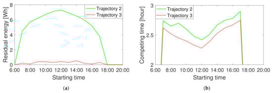 Figure 13 demonstrates the impact of the starting time . At the considered location and on the considered day, the sunrise was at 5:47 and the sunset was at 20:09. We conducted simulations with starting times from 6:00 to 20:00. We set K as 5000. As shown in Figure 13, starting too early or too late does not result in feasible inspection paths. The reason mainly lies in the harvesting energy. At the time near sunrise and sunset, the harvesting power is very low. During the daytime, with an increase in starting time, the residual energy and the completion time of the trajectory obtained by Algorithm 2 firstly increase and then decrease. For the trajectory obtained by Algorithm 3, the residual energy is near zero no matter when we start, but the completion time first decreases and then increases with the starting time. The shortest completion time is observed when the UAV starts at 12:00. Moreover, Algorithm 3 can shorten the inspection time by about 10 to 15 min in the simulations.