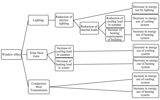 The amount of solar irradiation can be divided into visible light and heat []. Figure 1 emphasizes the importance of all factors affecting the energy use of a building that are affected by windows. As shown in Figure 1, the visible light emitted from the sun is being used as day lighting to reduce the electricity needed for the lighting system, which, consequently, also decreases the amount of cooling demand because of a lower internal load. However, a lower internal load causes higher energy use of heating systems in the winter. Solar radiation heats the building all the time. This heating role of the sun is useful during the wintertime and decreases the heating load, though it is not useful during the summer because it increases the cooling load and consequently increases the energy use of the cooling system. Heat loss in winter and heat gain in summer due to conduction heat transmission through windows increases the amount of energy used by the heating and cooling systems to compensate for the respective lost and gained heat. Therefore, the window affects the energy use of lighting, heating, and cooling systems of the building. Now, this question arises: Is there an optimal window size that is more beneficial for the energy use of the building. As seen in other studies, different climates adopt a certain range of optimal WWR. Based on Figure 1, including a window on a façade can have positive and negative roles in the energy use of a building during the year. In order to decide the optimal area of windows, total energy use (summation of lighting, heating, and cooling) is taken into consideration.