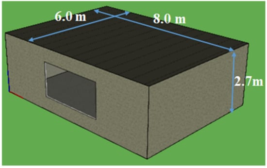 A building with specified envelope and ventilation properties from ASHRAE Standard-140 [] was chosen as the base for the study. The named standard represents a method of testing for the evaluation of computer programs dealing with building energy analysis. The building model is shown in Figure 2, and it’s geometry and envelope properties are based on the BESTEST model []. It is a 48 square meter rectangular building with no partitions inside. Windows are of double pane with clear glass on the south exposure. The building has two levels of weights of low and high. The difference between the two weight levels is in the materials and their thicknesses, and they are referred to as heavy-weight and light-weight buildings.