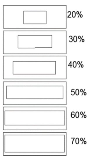 Different WWRs from 20% to 70%, as shown in Figure 3, have been studied. Windows were placed in the middle of the façade, and each of these windows was modelled separately on the southern, eastern, and western façades. The fraction of the frame to window’s total area was negligible and therefore effect of the window frames was excluded in this study.
