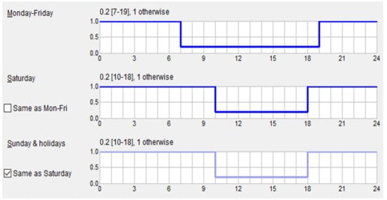 An ideal heater and an ideal cooler is defined for the model in order to measure the cooling and heating requirements. Ideal heaters and coolers are defined as stand-alone devices with no specific physical location and are not connected to the main plant []. A mechanical ventilation of Constant Air Volume (CAV) type was defined for the modelled building, with the specifications presented in Table 3. A total number of two occupants was considered for the building. The occupancy schedule was defined in such a way to meet the requirements based on a study in Swedish building regulations []. Based on this study, 14.7 and 17.5 h occupancy should be defined during weekdays and weekends, respectively. The occupancy schedule is shown in Figure 4. During weekdays, from 7:00 to 19:00, 20% occupancy was defined, and during weekends, from 10:00 to 18:00, 20% occupancy was defined. The rest of the hours, 100% occupancy was considered.
