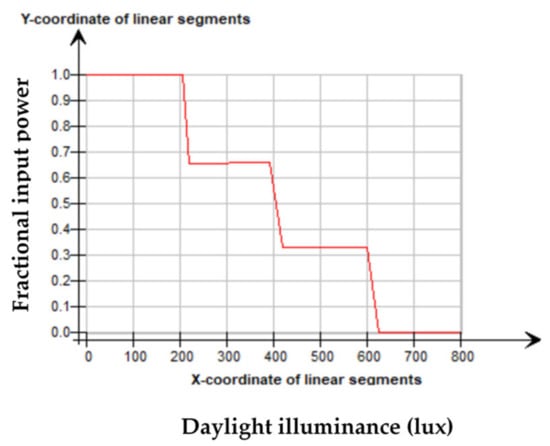 Based on the findings mentioned above, the importance of utilizing automated lighting in buildings, especially nonresidential buildings, has been highlighted. Automated lighting has been studied by Malavazos et al. [] in both residential and nonresidential buildings, and by Kumar et al. [] in residential buildings. Both research projects found a reduction in annual energy use of the buildings. Therefore, automatic lighting control has been employed for the studied buildings in this research for each of the WWRs shown in Figure 3. The sensors use a stepped control system. Sensors control lights or rows of lights according to the availability of natural daylight in discrete steps, as shown in Figure 5. The light sensors were placed on the center of the zone’s ceiling in IDA-ICE. For lighting purpose, 3 units, each of 10 W, were chosen. This case is represented as the base case to show the result.